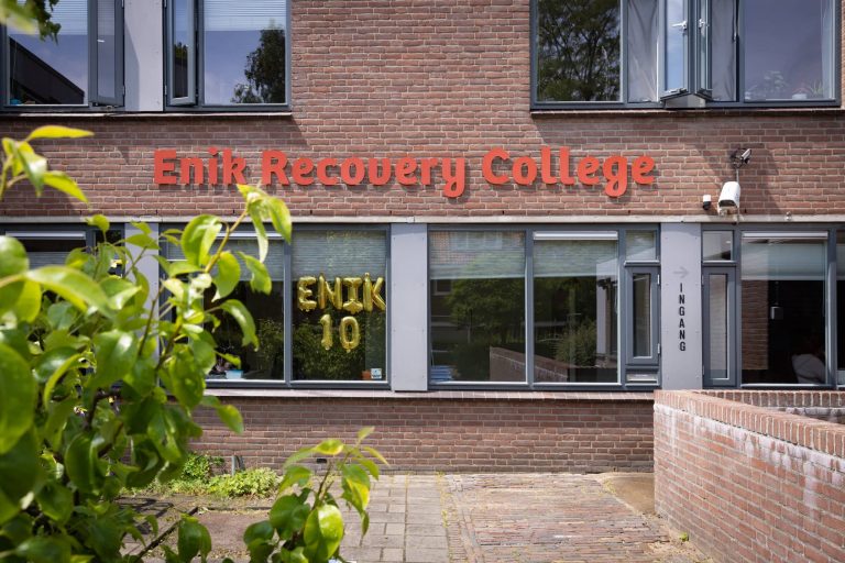 Enik Recovery College, zoals het voluit heet, is een bijzondere plek. Het is een leeromgeving en ontmoetingsplek door en voor mensen die ervaring hebben met ontwrichting door een psychische kwetsbaarheid of verslaving, en die willen werken aan hun ontwikkeling en herstel. Er komt geen hulpverlener aan te pas, er is geen intake, iedereen is welkom. Dat maakt Enik uniek.