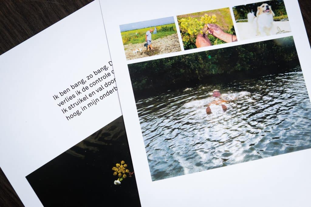Uiteindelijk besloot ik samen te werken met Renate, ik houd van haar fotografisch werk, wat zowel kwetsbaar als grappig is. Zij maakte bijpassende beelden. Daarnaast hebben we ook een ruimtelijk vormgever gevraagd, we wilden dat je als toeschouwer de verhalen op een bepaalde manier zou ervaren. Dat is gelukt. De foto’s en teksten zijn niet tegelijk te zien, maar je kunt wel door de panelen, waar we op exposeren, heen kijken. We hopen te bereiken dat mensen ook elkáár zien. Dat we allemaal hetzelfde zijn en allemaal anders zijn.’