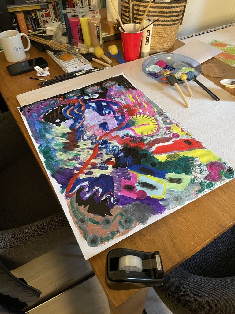 ‘Vaak zie ik tijdens zo’n sessie dat iemand ergens halverwege blokkeert, wanneer ze nog niet goed kunnen zien wat het kunstwerk aan het worden is. Dat is het moment waarop perfectionisme het gemakkelijkst grip op je krijgt, en je de moed kunt verliezen. Met wat woorden, oefeningen of tips, kan ik iemand dan vaak net even voorbij dat punt brengen. Vervolgens zie je diegene stralen van trots, omdat het toch gelukt is. Dit is fantastisch om getuige van te zijn. Vooral omdat ik weet dat je zo’n overwinning meeneemt in de rest van je leven; vanaf dat moment weet je dat jij in staat bent om door zo’n blokkade heen te breken. Dat is voor mij het allermooiste.’