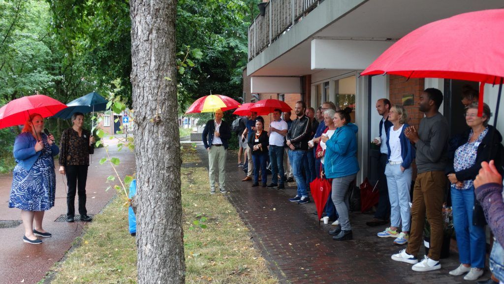 Begin juli heeft het internationaal bekende schilderscollectief De Strakke Hand uit Utrecht de muurschildering gerealiseerd. Donderdag 21 juli werd de muurschildering onthuld in aanwezigheid van relaties, medewerkers van Lister, omwonenden én Harry Muré, biograaf van Jeanne Immink. Hij vertelde over haar opmerkelijke leven en haar ongewoon moedige kwaliteiten als bergbeklimster. (opent in nieuw tabblad)Met een heerlijke kop koffie of thee en een klein taartje bewonderden omwonenden en medewerkers van Lister in de regen de muurschildering. Iedereen vindt de afbeelding van Jeanne staand op een richel tegen een steile bergwand in de Dolomieten een welkome verfraaiing van het straatbeeld in de wijk Lunetten.