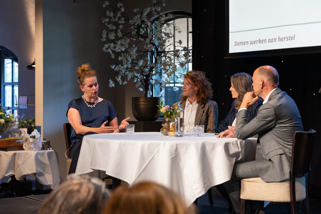 Onder leiding van dagvoorzitter Esther van Rijswijk vonden op het podium 2 gesprekken plaats. Het eerste ging over leefstijl en de rol daarvan bij herstel. Cliënt Leonard vertelde over de stapjes die hij onder begeleiding zette om maar liefst 30 kilo af te vallen. ‘Je hebt een wonder verricht’, sprak Theo enthousiast. Thea van Wijk, adviseur leefstijl bij Lister, vertelde hoe leefstijl bij Lister is gekoppeld aan zingeving, en dat het bij voorkeur onderdeel is van de begeleiding die cliënten krijgen. Dat is niet altijd eenvoudig. Thea: ‘Het begint ermee dat je als begeleider aan je cliënt vraagt: mag ik het met je over je leefstijl hebben?’ Dat kan ook, voegde Theo eraan toe, als je bij Lister komt voor iets heel anders. ‘Bij leefstijl gaat het niet alleen om fysieke gezondheid. Het is een andere manier om naar herstel te kijken. Tijdens sport en bewegen heb je al contact voordat je met elkaar praat. Je moet jezelf laten zien, anders speelt niemand je de bal toe.’