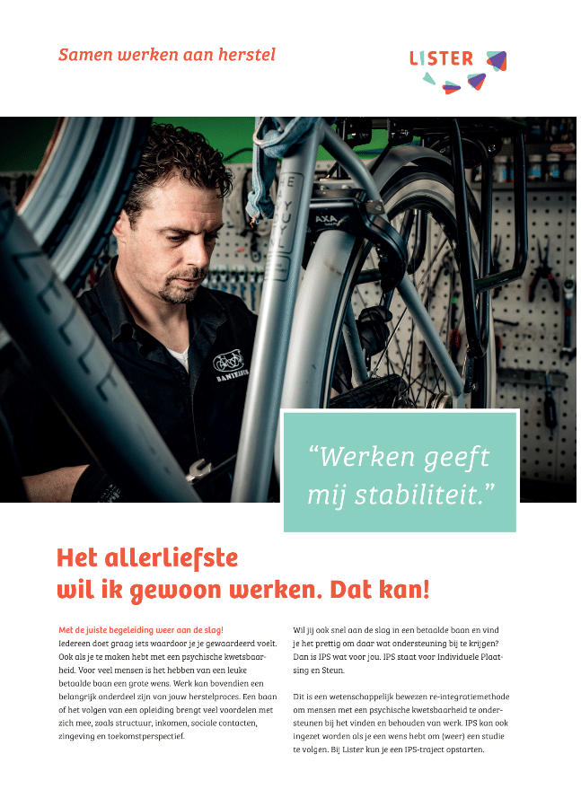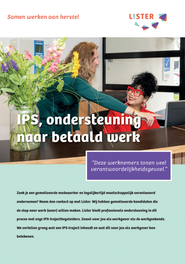 Lister werkt onder andere met Individuele Plaatsing en Steun (opent in nieuw tabblad) (IPS). IPS is voor cliënten die voor het eerst een betaalde baan zoeken. Het is ook voor cliënten die nu geen betaalde baan hebben. Maar die dat in de toekomst wel weer willen. IPS is ook voor cliënten die zich willen voorbereiden op een betaalde baan.